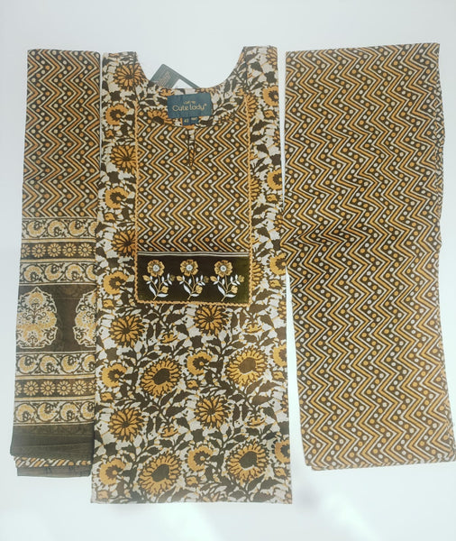• Design: Features an embroidered neckline with delicate white floral motifs framed by a chevron-printed panel. The 3/4 sleeves include matching border detailing.